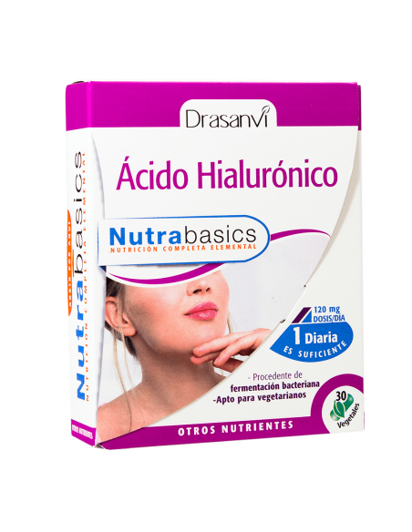 El Ácido Hialurónico es un polisacárido, azúcar, con funciones estructurales. Tiene una textura viscosa que entra a formar parte de la piel, cartílagos y articulaciones. La combinación de las cadenas de carbohidratos forma una estructura compleja, en forma de espiral y tiene una alta capacidad para retener grandes cantidades de agua. A diferencia de otros complementos de Ácido Hialurónico, que se elaboran a partir de animales como las aves o el vacuno, las cápsulas de Ácido Hialurónico de Drasanvi se obtienen a partir de fermentación bacteriana, lo que lo convierte en un producto diferenciador de mayor calidad y apto para vegetarianos.