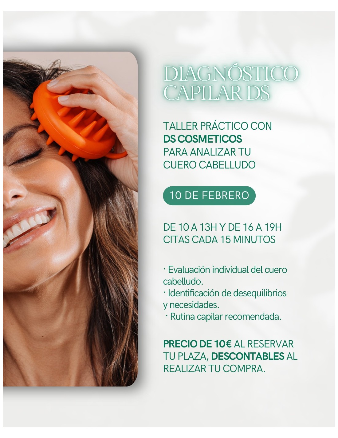 Reserva tu plaza para el Diagnóstico Capilar DS, un taller práctico presencial donde analizaremos el estado de tu cuero cabelludo de forma individual. La sesión incluye evaluación personalizada, identificación de desequilibrios y recomendaciones de rutina capilar adaptadas a tus necesidades. El evento tendrá lugar el 10 de febrero, con citas cada 15 minutos en horario de 10:00 a 13:00 y de 16:00 a 19:00. La reserva tiene un coste de 10 €, descontable posteriormente en tu compra de productos DS Cosméticos.